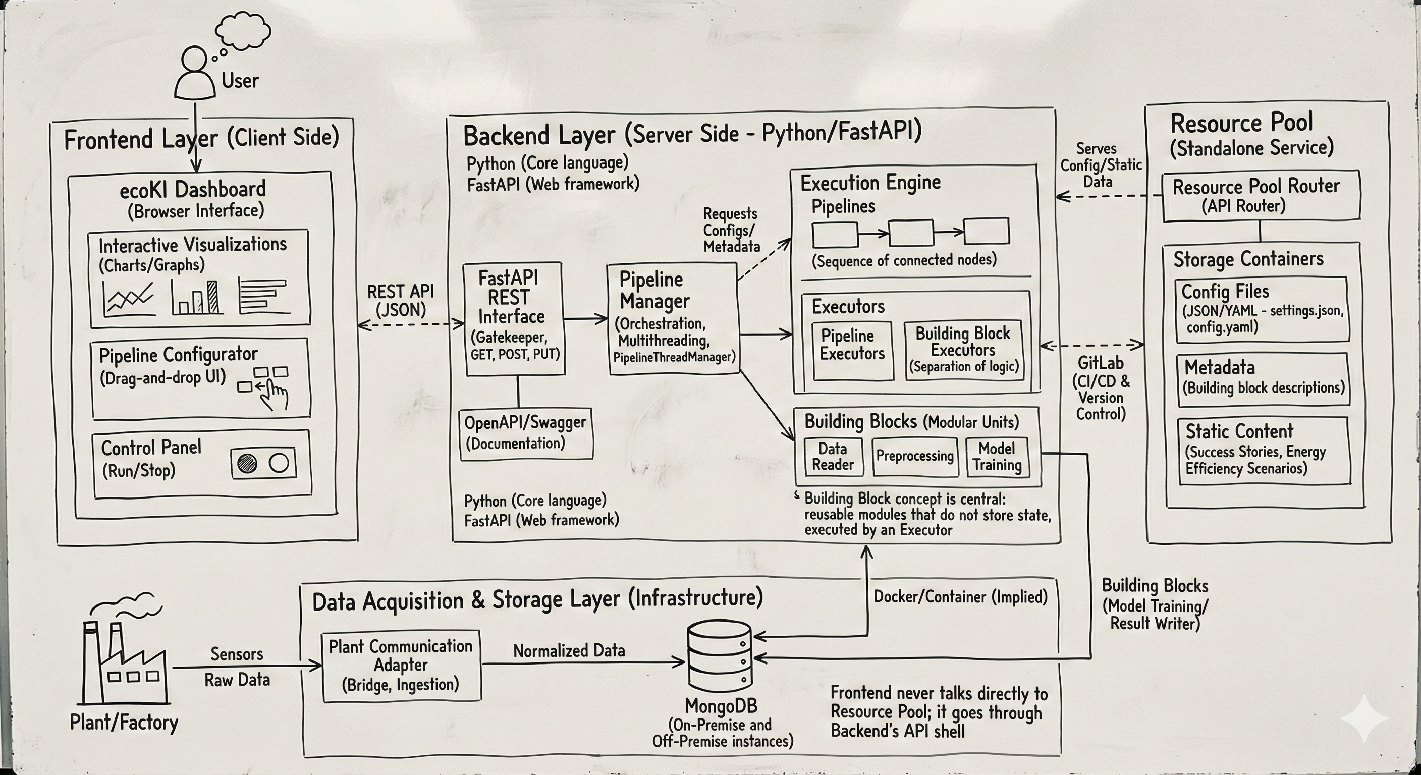 EcoKI System Architecture: A layered microservices architecture designed for industrial machine learning applications, comprising Frontend, Backend, Execution Engine, Resource Pool, and Data Acquisition layers.#